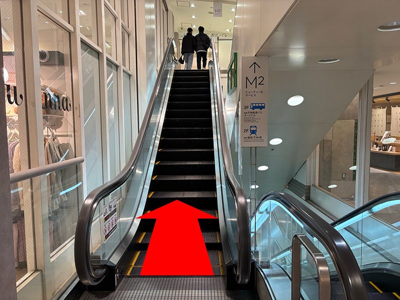 5.「ソラリアステージM2階」までのぼったら、床の矢印表示にしたがって2階までのぼります。
