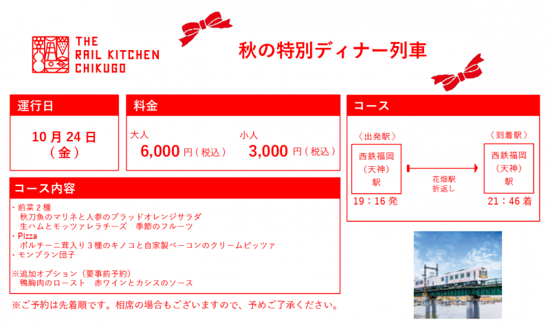 【料理写真更新】秋の特別ディナー列車を10月24日(金)に運行します
