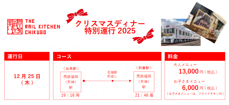 地域を味わう旅列車「THE RAIL KITCHEN CHIKUGO」では、2025年12月25日(木)に、クリスマスディナー特別運行を開催します。