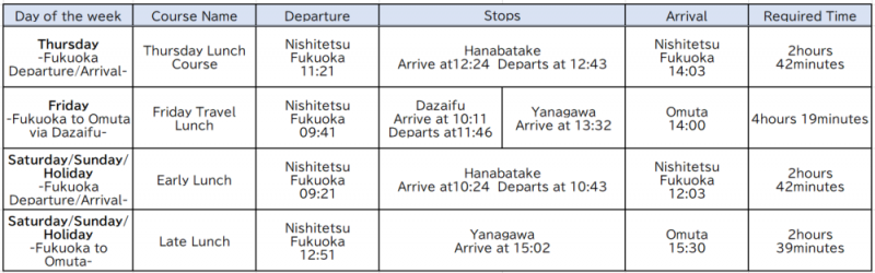 Nishitetsu will implement a timetable revision on March 14. Consequently, the operating hours for THE RAIL KITCHEN CHIKUGO will change. Please refer to the table below for detailed schedules.